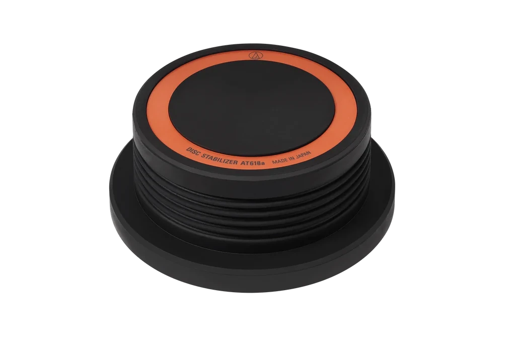 The Audio Technica AT618a disc stabilizer fits over the turntable spindle to hold records firmly in place, reducing resonance and improving sound quality. The stabilizer is constructed of machined brass with a protective rubber cover.